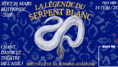 Du 30 au 31 mar 2026La Semaine Asiatique présente *La Légende du Serpent Blanc*, spectacle mêlant danse, chant, musique et arts martiaux, les 30 et 31 mars 2026 à la Rotonde de l’INSA Lyon. Ouverture 19h30, début 20h. Des artistes de diverses cultures asiatiques y célèbrent la richesse artistique de l’Asie, entre traditions et créations contemporaines.